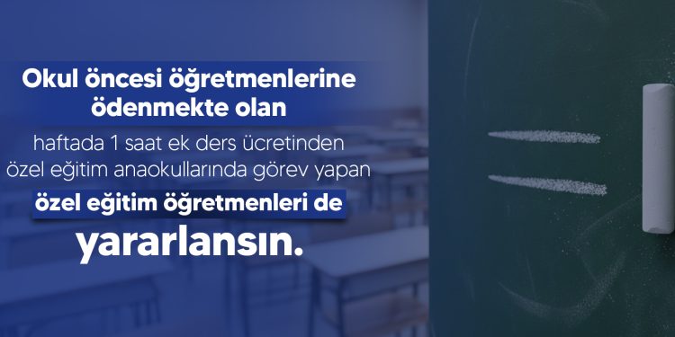 Toplu Sözleşmenin “Okul öncesi öğretmenlerine ilave ek ders ücreti” başlıklı 39.maddesinde “Okul öncesi öğretmenlerine  öğrencilerin yeme, yatma, dinlenme, eğitim-öğretim ve benzeri hizmetlerinin fiilen yürütülmesi karşılığında haftada 1 saat ek ders ücreti ödenir.” düzenlemesine yer verilerek; 2026 yılından geçerli olmak üzere okul öncesi öğretmenlerine haftada 1 saat yeme, yatma, dinlenme, eğitim-öğretim ve benzeri hizmetlerin karşılığı olarak ek ders ücreti ödenmeye başlanmıştır. Ancak özel eğitim anaokullarında aynı sınıfı okutan, aynı dersleri veren, aynı öğrencilere öğretmenlik yapan, mezkur madde de sayılan görevleri yerine getiren özel eğitim öğretmenlerine bu ek ders ücreti ödenmemektedir. Bu durum özel eğitim anaokullarında çalışma barışını bozmuş, eşitlik ilkesine aykırılık teşkil etmiştir. Bu okullarda okul öncesi öğretmenleri kadar özel eğitim öğretmenleri de emek sarf etmekte, görev ve sorumluluklarını yerine getirmektedir. Bu minvalde okul öncesine toplu sözleşme hükümleri gereği ödenmekte olan haftada 1 saat ek ders ücretinden özel eğitim öğretmenleri de yararlandırılmalıdır.