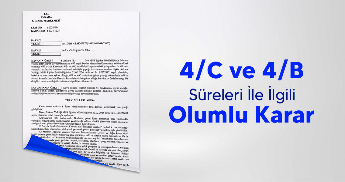 Sendikamız üyesi adına, 657 sayılı Kanunun 4/C ve 4/B maddeleri kapsamındaki çalışmaların da dikkate alınarak tarafına bir kademe verilmesi hususunda yapılan başvurunun reddi üzerine dava açılmıştır. Ankara 8. İdare Mahkemesi’nin 2024/444 E., 2024/1225 K. sayılı ve 05.07.2024 tarihli kararında; “…Bu durumda, 657 sayılı Devlet Memurları Kanunu’nun 4/A maddesi kapsamında kadrolu “memur” olarak görev yapan ve olumsuz bir durumu bulunmayan davacının aynı Kanunun 4/C maddesi kapsamında ‘geçici personel’ ve 4/B maddesi kapsamında ‘sözleşmeli personel’ olarak görev yaptığı hizmet sürelerinin yukarıda anılan mevzuat gereği sekiz yıllık süre hesabında değerlendirilerek davacıya bir kademe verilmesi gerekirken aksi yönde tesis edilen dava konusu işlemde hukuka uyarlık bulunmadığı sonuç ve kanaatine varılmıştır.” denilerek, dava konusu işlemin iptaline karar verilmiştir.